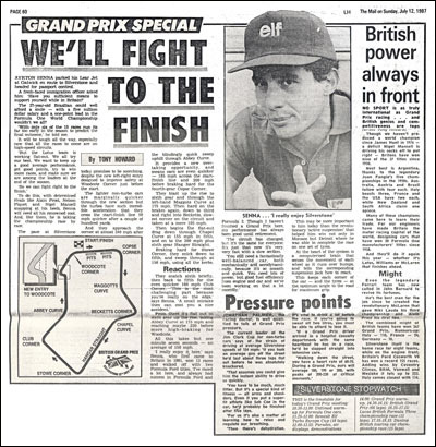 The millions of words that must have been written or spoken about Ayrton Senna da Silva inevitably include myriad adjectives, among them: articulate, controversial, courageous, focused, virtuoso, patriotic, philanthropic, quick, ruthless, shy, spiritual, tragic, religious. And as the soundtrack relates: “There was an energy, a force, a spirit that was electrifying.” If I may, I’ll conclude with this July 12 1987 page from my Mail on Sunday clippings file, which I hope captures something of the beginnings of Senna’s burgeoning success: 3246 words copyright © 2011 by Anthony Howard Picture credits from the top: Universal Pictures; Gabriele; Mike Powell/Getty; Anon; Getty Images; STF-AFP/Getty; Toshifumi Kitamura/AFP/Getty; Allsport; LAT. Read this Senna the Movie story in the Pattaya Mail, Thailand: http://www.pattayamail.com/automania/senna-4669