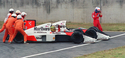 The antagonism between the pair intensified at the 1989 San Marino race. Prost and Senna had agreed that neither would hinder the other on the way into the first corner, and Senna led from the start without incident. When the race was re-started after Gerhard Berger’s lap 4 accident, Prost made the quicker getaway but Senna nevertheless pushed past him into the first corner. Poised Came the penultimate race at Suzuka, and Prost led the championship with 72 points to Senna's 60. Though Senna was on pole, Prost made the far better start and increased his lead to six seconds in the first half. Then a new set of tyres enabled Senna to begin closing on Prost, catching him by lap 40. On lap 46, through the 130R ultra-fast left-hander, Senna was poised to overtake and began to do so into the chicane. Prost moved across to block Senna, and neither would give way. So the two slid to a halt, engines stalled and wheels interlocked, in the chicane escape road. Prost – thinking game over – climbed out of his car while Senna cadged a bump-start from marshals, called at the pits for a new front wing, and pressed on to win the race.
